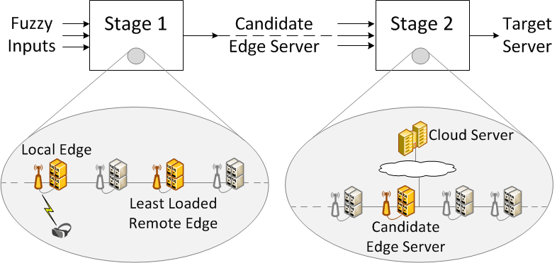 In this application we introduce a fuzzy logic based workload orchestrator. In our design, two stage fuzzy logic system is used as shown in Figure 1. In the first stage, the most convenient edge server in the edge layer is found. In the second stage, the candidate edge server and the cloud server are compared. As a result of these operations, the proposed fuzzy logic based workload orchestrator finds a target server which can be the local edge server, remote edge server or the cloud server.